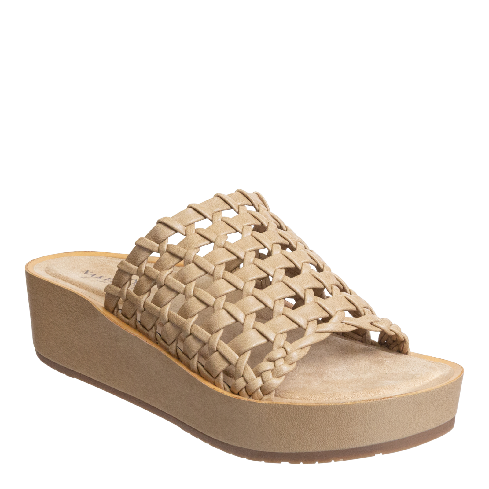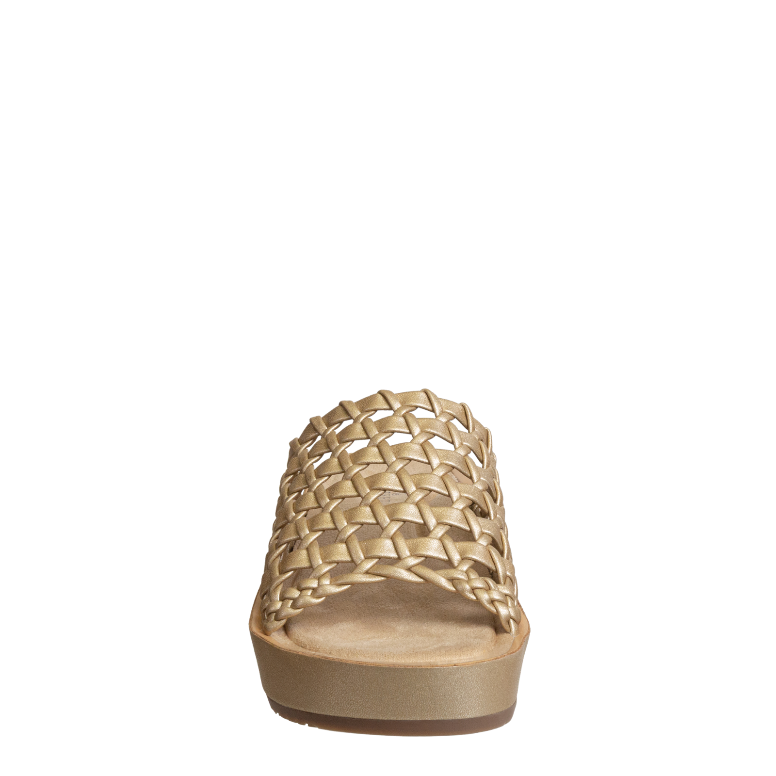Adorn yourself with a glimmering summer essential. These woven platform sandals are crafted with beautiful artisanal details on an effortless slip-on design. This soft gold pairs well with a bohemian wardrobe and your evening resort-wear attire.